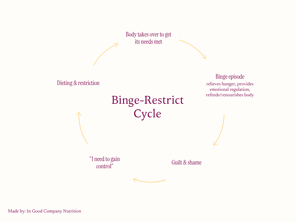 Bingeing is often a response to restriction. When we focus only on stopping bingeing without addressing restriction, the cycle continues.